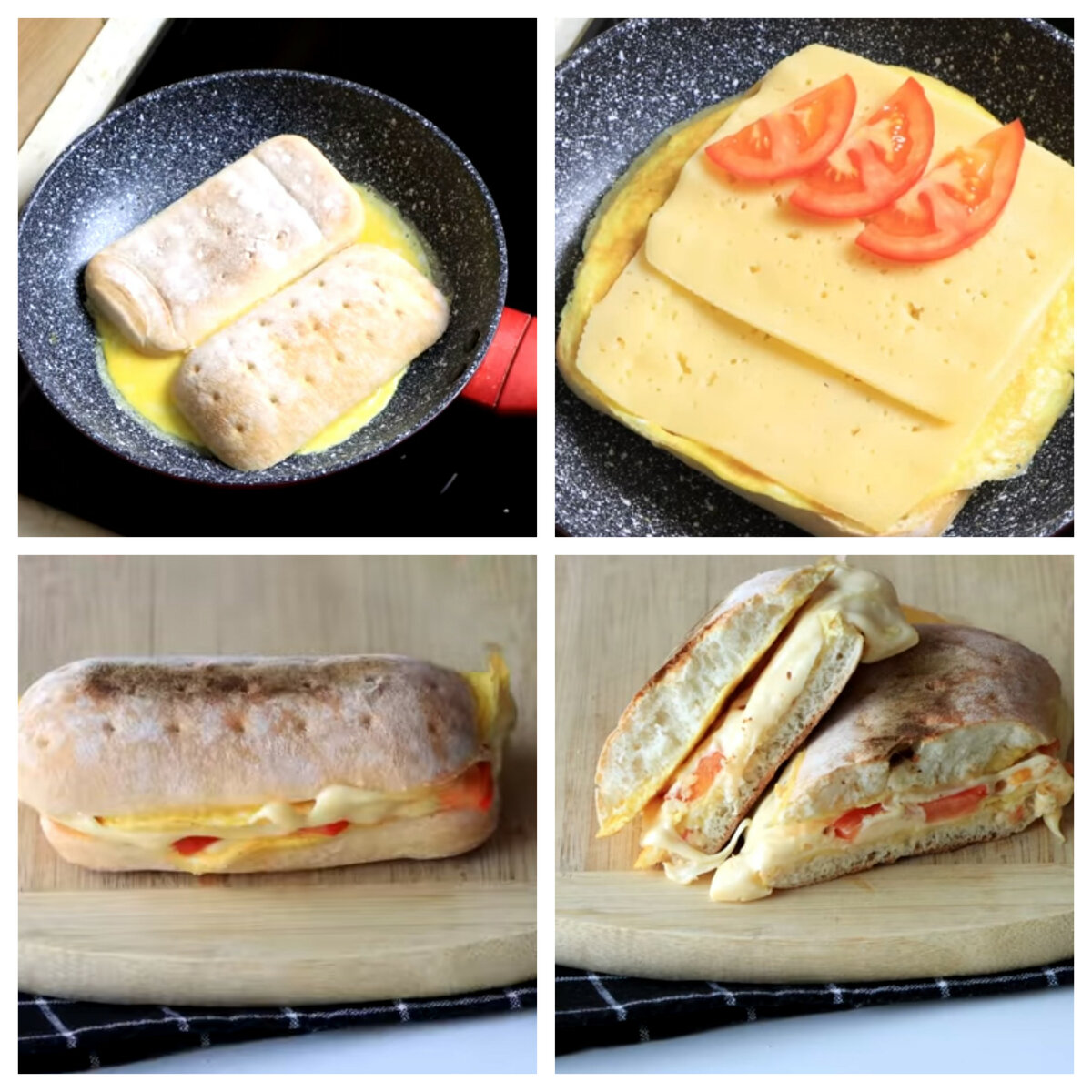 Мы взбиваем яйцо, переливаем ее в сковороду. Когда яйцо немного схватится, мы брём разрезаем булочку пополам и кладем сверху. Все переворачиваем и выкладываем на одну половину начинку у меня это сыр и помидор.