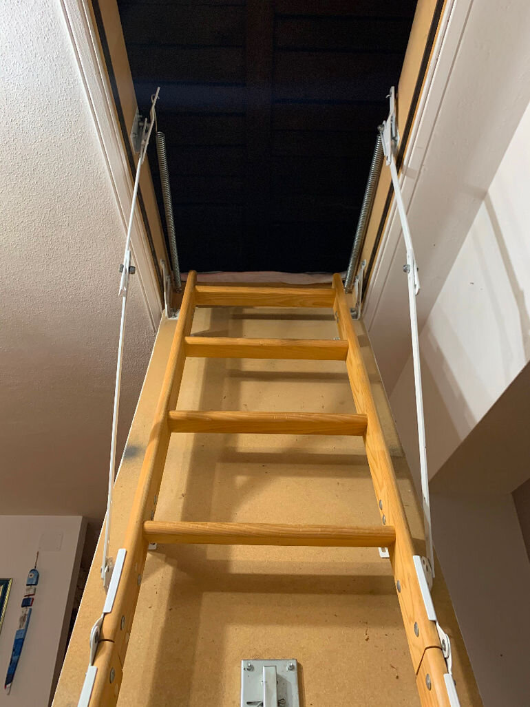 При строительстве дома с чердаком для хранения вещей, которые используются не часто, в плите оставили проем. Чтобы не использовать переносную лестницу и для экономии пространства жилой комнаты для входа на чердачное помещение мы приобрели удобную складную конструкцию, в комплект которой входит и сам люк. Главное правильно подобрать типоразмер для герметичности и теплоизоляции.