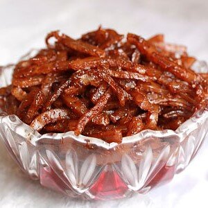 1. Свиную шкурку приготовим так, как указано в предыдущем рецепте. Почистим, отварим в подсоленной воде, отскоблим жировую прослойку, накрошим на полоски.