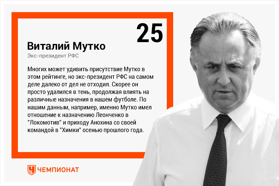 В период с ноября 2020 года по январь 2021-го «Чемпионат» провёл опрос среди менеджеров, функционеров и агентов с целью определить самых влиятельных людей российского футбола. Мы предлагали респондентам список из 50 деятелей футбола — кто набирал большее количество баллов, тот и попадал в рейтинг. Наши собеседники могли вписать и своего кандидата. Один из опрошенных попал в итоговый список.