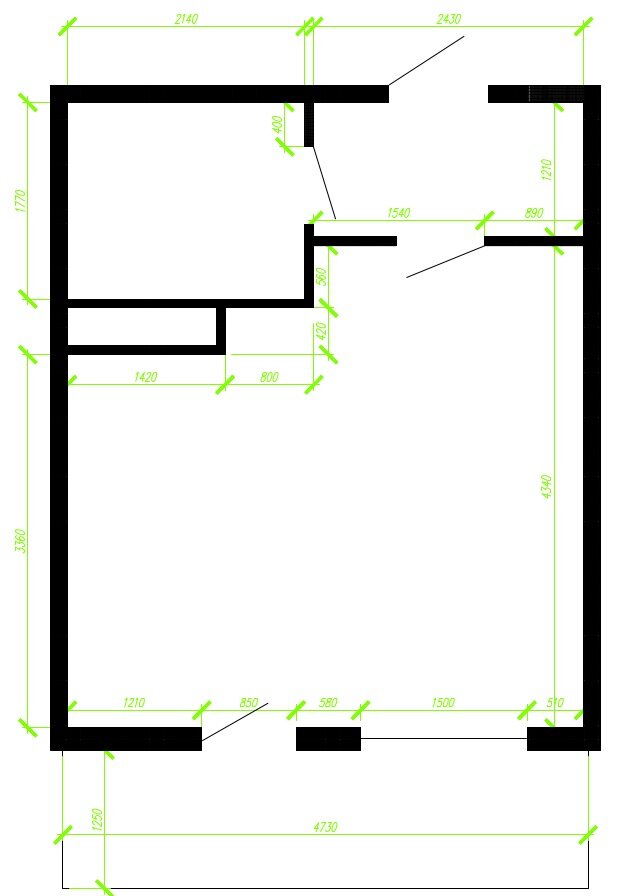 Мебель предназначенная к размещению: кухонный гарнитур, диван, шкаф, кухонный стол / барная стойка. При этом все коммуникации и кабель для электроплиты находятся у вентиляционного короба, а нарушать отделку нет желания.