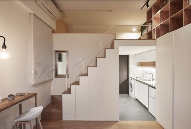 Маленькая квартира площадью 22 кв. м превратилась в уютное интерьерное пространство за счет удачной планировки, современного дизайна и светлой цветовой гаммы. Второй уровень в виде бельэтажа со спальным местом - удачная находка для того, чтобы сэкономить пространство и получить дополнительную зону для хранения вещей под лестницей.