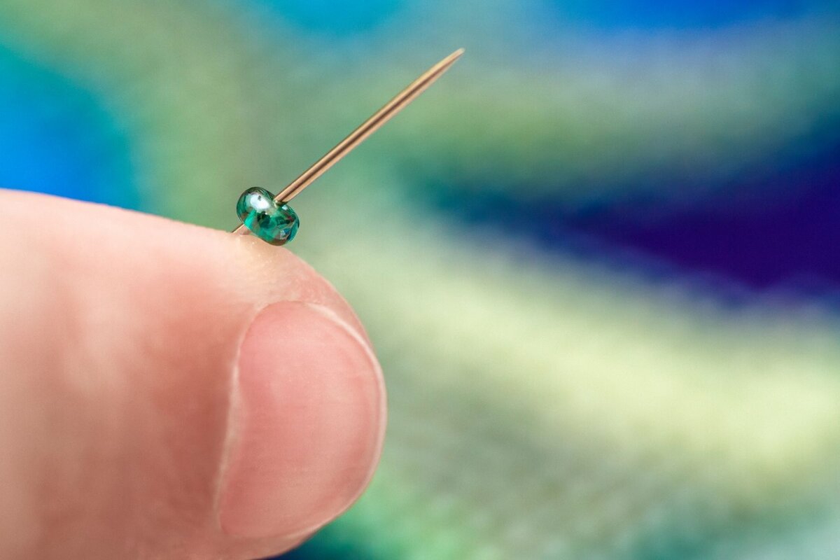Желательно использовать нити из нейлона или шелковые бисерные. Хлопковая нить может разорваться, особенно при соприкосновении с острыми краями бусин. При выполнении работы с бисером нужно удвоить нить на игле.
