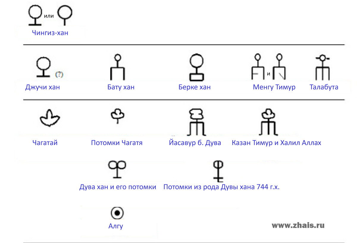 На большинстве монетах Золотой Орды ставился родовой (фамильный) знак - тамга (печать). Ниже приведены родовые знаки некоторых правителей Орды.