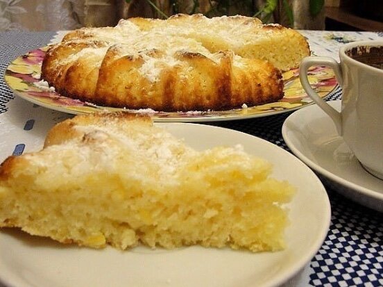 6 Отправляем в заранее прогретую духовочку.Температура в печке не более 200 градусов.Верхняя часть манника всегда бледнее нежели низ.Через 15-20 минут проверьте зубочисткой готовность пирожка,если зубочистка сухая вынимайте! Готовый пирожок выкладывайте на блюдо и посыпайте сахарной пудрой.Радуйте своих родных и близких людей вкусным шедевром;) До скорых встреч,на моем канале!