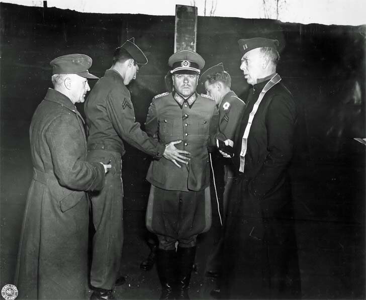 German General Anton Dostler, who was sentenced to death on charges of penalty 15 surrendered captured US spies, tied to a pole in front of the shooting.