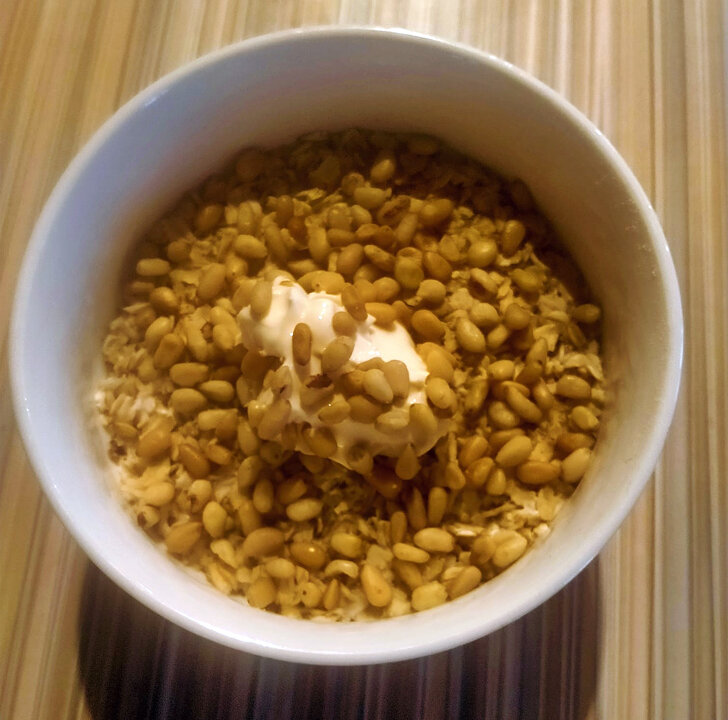 Через 5 минут положила сверху столовую ложку сметаны и посыпала всё щедро кедровыми орехами.