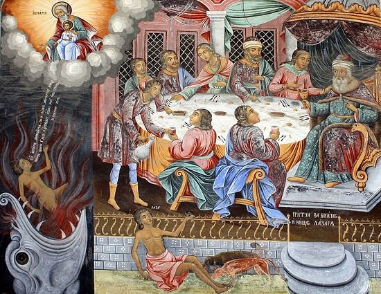 Некоторый человек был богат, одевался в порфиру и виссон и каждый день пиршествовал блистательно. Был также некоторый нищий, именем Лазарь, который лежал у ворот его в струпьях и желал напитаться крошками, падающими со стола богача, и псы, приходя, лизали струпья его. Умер нищий и отнесен был Ангелами на лоно Авраамово. Умер и богач, и похоронили его. И в аде, будучи в муках, он поднял глаза свои, увидел вдали Авраама и Лазаря на лоне его и, возопив, сказал: отче Аврааме! умилосердись надо мною и пошли Лазаря, чтобы омочил конец перста своего в воде и прохладил язык мой, ибо я мучаюсь в пламени сем. Но Авраам сказал: чадо! вспомни, что ты получил уже доброе твое в жизни твоей, а Лазарь — злое; ныне же он здесь утешается, а ты страдаешь; и сверх всего того между нами и вами утверждена великая пропасть, так что хотящие перейти отсюда к вам не могут, также и оттуда к нам не переходят. Тогда сказал он: так прошу тебя, отче, пошли его в дом отца моего, ибо у меня пять братьев; пусть он засвидетельствует им, чтобы и они не пришли в это место мучения. Авраам сказал ему: у них есть Моисей и пророки; пусть слушают их. Он же сказал: нет, отче Аврааме, но если кто из мертвых придет к ним, покаются. Тогда Авраам сказал ему: если Моисея и пророков не слушают, то если бы кто и из мертвых воскрес, не поверят.