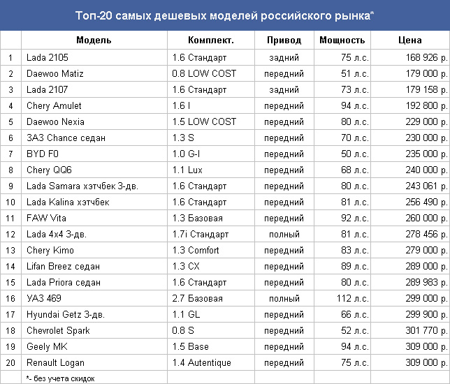 Россия по-прежнему страна не очень богатая, и поэтому далеко не все россияне готовы платить за дорогой современный автомобиль. На нашем рынке, как и на рынках других развивающихся стран, большой популярностью пользуются недорогие автомобили в простых комплектациях. Так, согласно опросу, проведенному AutoNews.ru, в котором спрашивалось о намерениях респондентов приобрести автомобиль до конца 2010 года, 14,9% человек из почти 12 000 опрошенных указали, что собираются в ближайшее время приобрести автомобиль стоимостью до 300 тысяч рублей. Это как раз самый дешевый сегмент российского рынка, где представлено не так уж мало автомобилей. В цену до 300 000 рублей на нашем рынке укладывается почти два десятка моделей, и это если не учитывать разнообразных скидок, которыми балуют покупателя продавцы. Скидки все время варьируются и то исчезают, то появляются вновь. Ориентироваться приходится на ценники, которые продавцы поставили на новые автомобили свежего года выпуска. Специально для тех, кто не верит в экспансию китайских автомобилей на российский рынок, – можете убедиться: в топ-20 самых дешевых на сегодня автомобилей российского рынка представлены семь российских моделей и семь китайских. Пусть по количеству продаж китайцы пока серьезно проигрывают, но если на семи штуках российские разработки уже почти закончились, то китайские только начинаются. За пределами сегмента самых дешевых автомобилей осталось еще немало китайских моделей. Кроме китайцев и наших, к которым еще можно причислить собираемый в Москве Renault Logan, в список самых дешевых автомобилей входят две модели из Узбекистана, две, собираемые в Южной Корее, и еще одна, которую к нам везут с Украины.