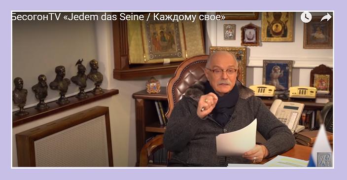 Речь пойдет о новом выпуске "Бесогона" Никиты Михалкова. С первого раза я это не досмотрел и не дослушал. Забалтывает важную тему. На другой день вернулся - захотелось разобраться, что не так в его манере изложения материала. Автор сразу оговорился: "мы получили много отзывов на предыдущие программы" и "Я прошу не искать в наших словах какой-то аксиомы, утверждения, конкретики" Да, уж. Это вам не расследования от ФБК, где многое строится на фактах.