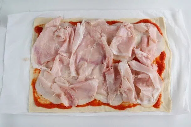 Раскатайте готовое тесто для пиццы и покройте ее с томатным соусом. Разложите ломтики копченого сыра и вареную ветчину.