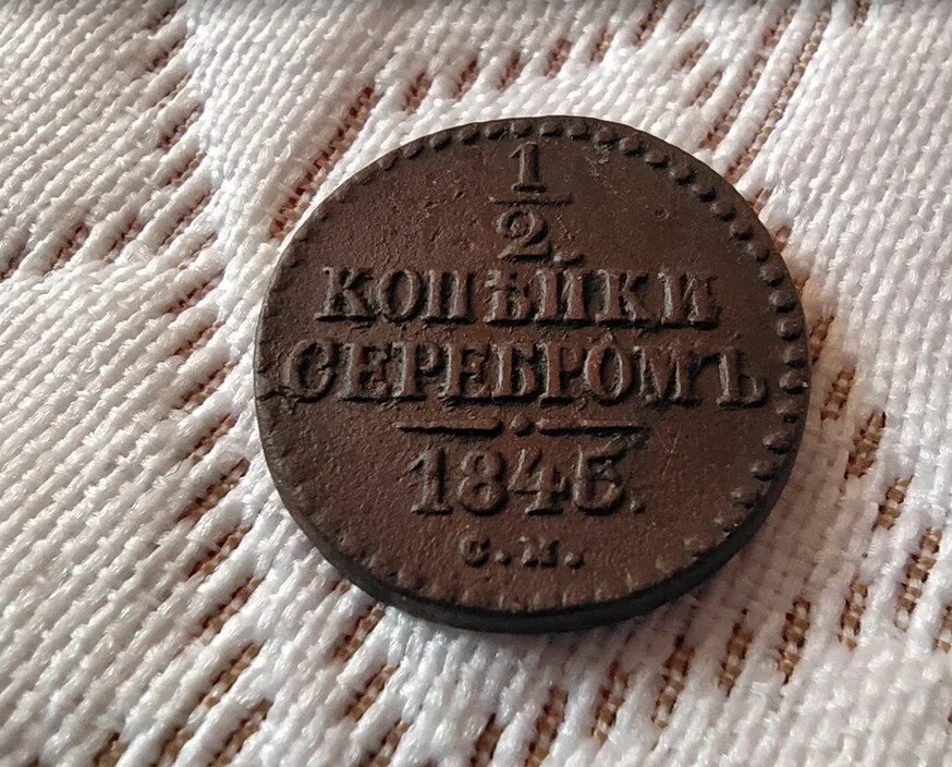 Вот такая монетка номиналом в одну вторую копейки 1845 года у меня в коллекции медной погодовки времен Российской Империи: