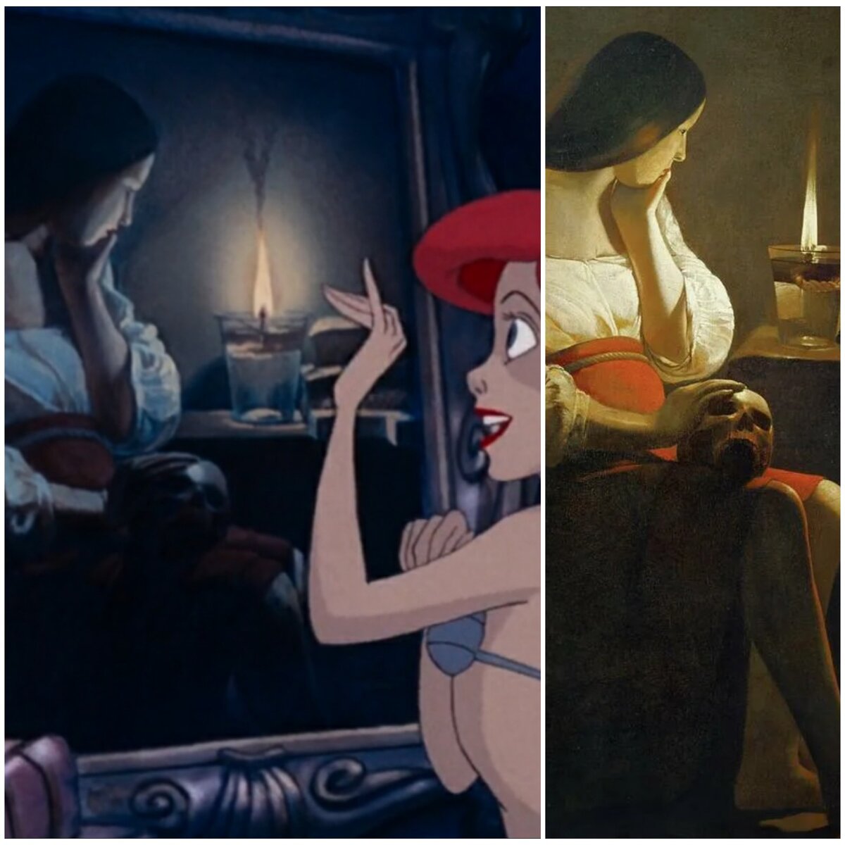Почти в самом начале мультфильма, в сцене, где Ариэль поёт о том, как хочет стать человеком, она подплывает к картине. При детальном изучении и после недолгих поисков я выяснила, что картина эта совершенно реальна и принадлежит кисти французского художника-живописца Жоржа де Ла Тура и называется "Магдалина со светильником". Очень необычный выбор для мультика про принцессу, учитывая, что на картине помимо прочего изображен череп и смысл её далек от позитивного. Одиночество, страх перед будущим...может так аниматор хотел сделать акцент на глубинных чувствах Ариель?