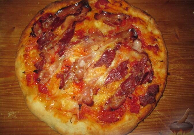 Пицца с беконом и копченым сыром готова. Приятного аппетита!
