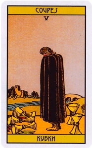 Полное описание колоды на сайте: На Четверке Кубков герой хорошо поразмыслил о себе и о жизни. Вот итог. На аркане стоит человек, обернувшись в черный плащ. Поза скорбная. Плечи опущены. Ему больно. Кубки раскиданы и опрокинуты. Он от них уходит. Он уже к ним и к нам спиной. Его не остановить. Действительно, на Четверке пришел ряд открытий. Главные из них: всем не угодить и надо жить своей жизнью. А то, что так радовало на двойке и тройке оказалось фальшивым. Наигранным. Пафосным. Не родным. Это нормально. Ребенок рождается как чистый лист бумаги и воспринимает мир через своих родителей. И сперва, став взрослым, по инерции продолжает их установки. Но через какое-то время начинает понимать, что он не их клон. Он имеет право на свою судьбу. Уникальную. И столь же уникальны и его желания. Вот как раз сейчас он это осознал! А значит надо решиться расстаться с прежними партнерами, друзьями, увлечениями. Нажитыми под чужим влиянием. Только вот беда, они все теперь чувствуют себя преданными,