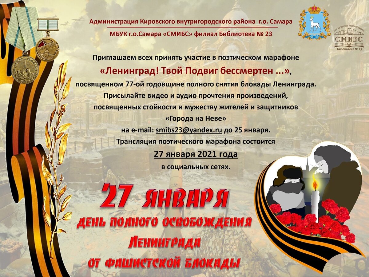 Библиотека № 23 СМИБС Самара при поддержке Администрации Кировского внутригородского района г.о. Самара приглашает Вас принять участие в поэтическом марафоне "ЛЕНИНГРАД! ТВОЙ ПОДВИГ БЕССМЕРТЕН!".