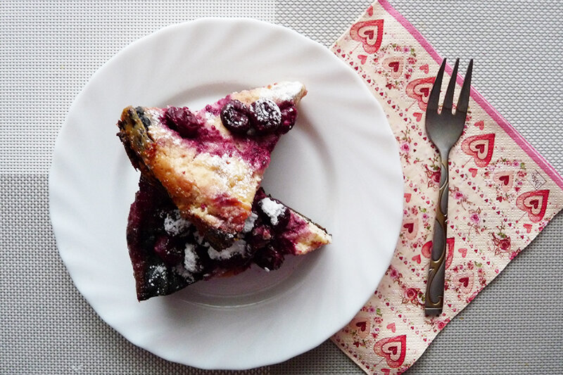 Смажем чашу мультиварки маслом (растительным или кусочком сливочного) до середины чаши. Выливаем черное тесто. Сверху выкладываем белое тесто. Неважно как его выложить. В процессе приготовления черное тесто все равно выйдет по бокам наверх. Сверху кладем в хаотичном порядке вишню. Можно любую другую ягоду, на ваш вкус.