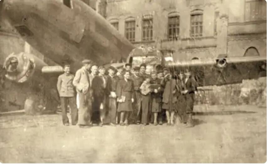 Мы у самолета Ли-2 в 1948 г. у техникума — начало творческой деятельности и в 1999 г. на территории завода — завершение работы моей и коллектива ОКБ/ОКО