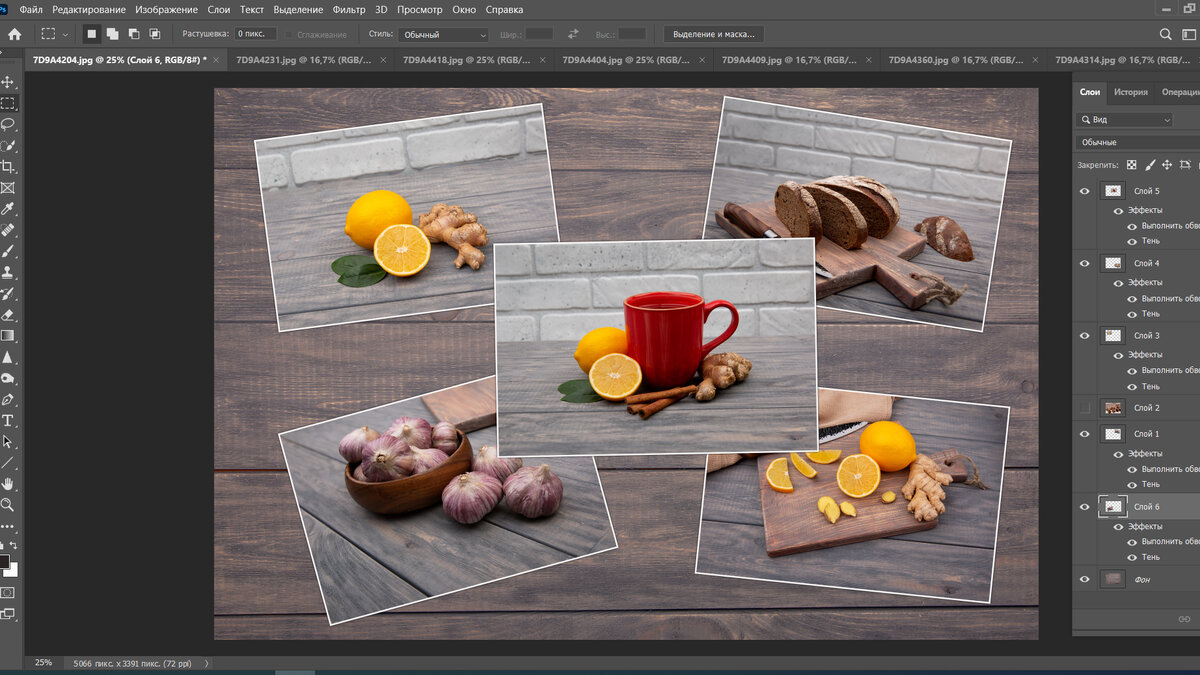 Теперь, чтобы не делать одно и тоже несколько рах, просто берем и копируем стили со слоя с первым изображением на все остальные. Для этого нужно зажать клавишу Alt и, кликнув на пункт "Эффекты" мышкой прямо под слоем, перетянуть все эффекты на слой выше. И так делаем на все фотографии.