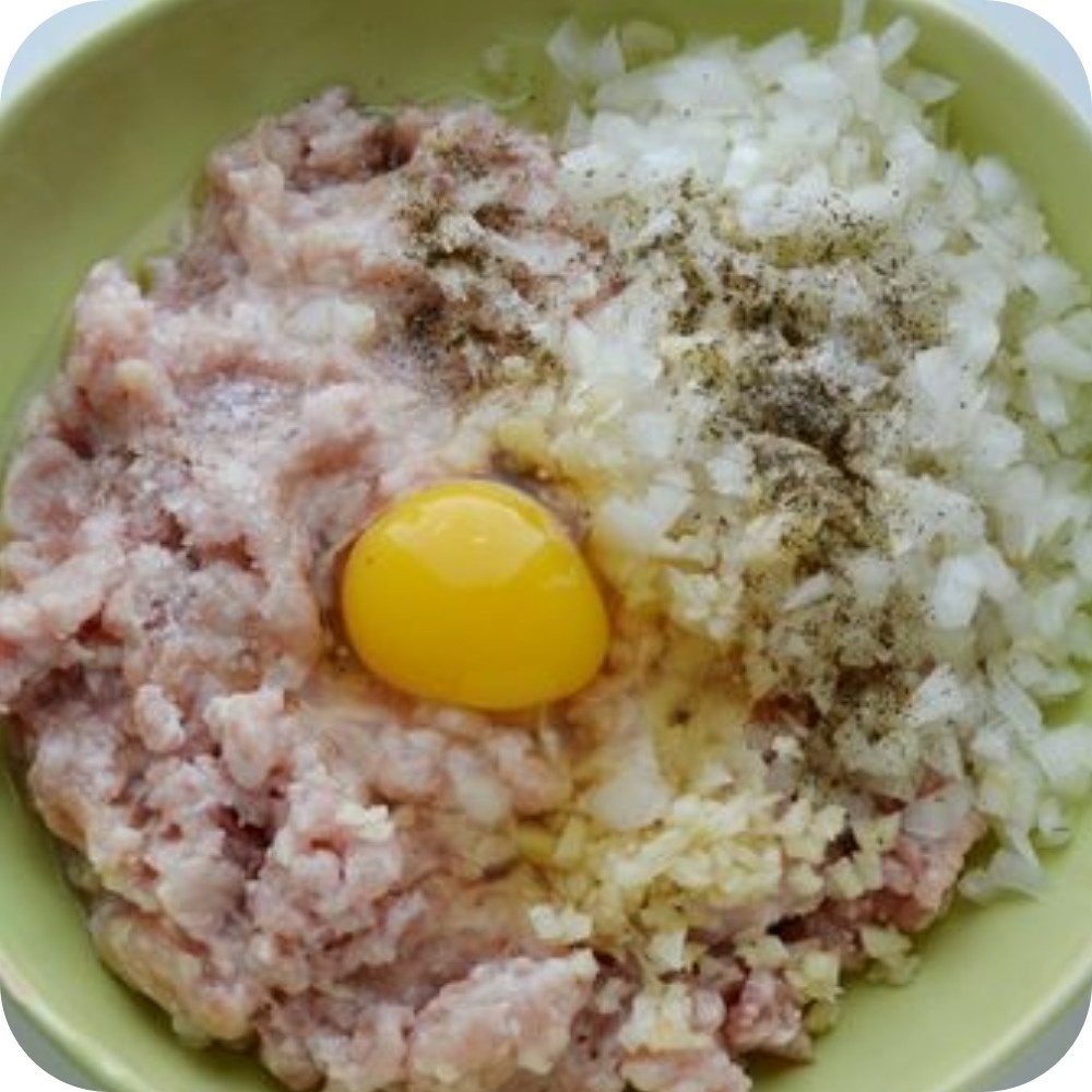 1. В емкость выкладываем фарш, мелко нарезанный лук, чеснок, яйцо, соль, перец. Все хорошо перемешиваем и формируем шарики.
