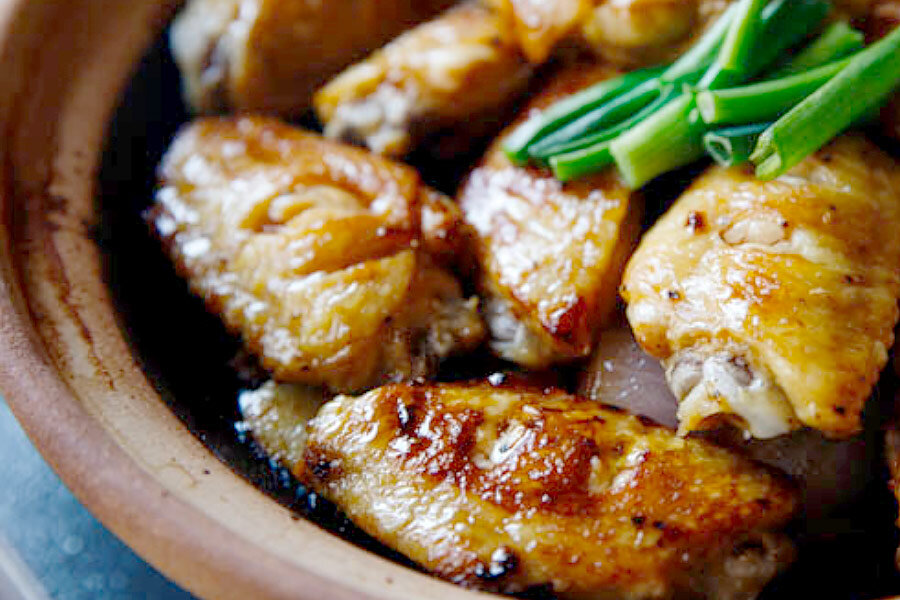 - На крыльях сделайте небольшие поперечные надрезы и переложите в миску. Добавьте соль, черный перец, устричный соус, половину имбиря и зеленую часть зеленого лука. Хорошенько перемешайте и оставьте на 15 минут.