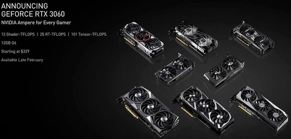В этом месяце NVIDIA представила видеокарту GeForce RTX 3060 и объявила, что в продажу она поступит в конце февраля с рекомендованным ценником $330. Чипмейкер не будет выпускать собственную версию в исполнении Founders Edition, так что придётся довольствоваться моделями от AIB-партнёров. На данный момент ещё ни один магазин не выставил GeForce RTX 3060 для предзаказа. В большинстве магазинов