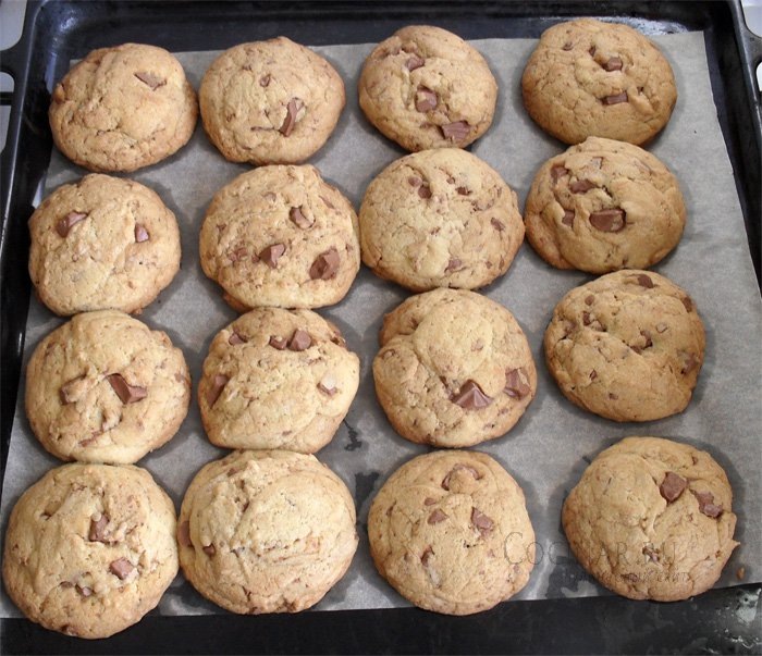 - Вылепляем кружочки. Можно раскатать тесто в пласт и вырезать кружочки, а я просто расплющила шарики теста. Выпекаем песочное печенье с шоколадной крошкой 20-25 минут при t 190°С, в общем, до готовности. Все зависит от духовки.
