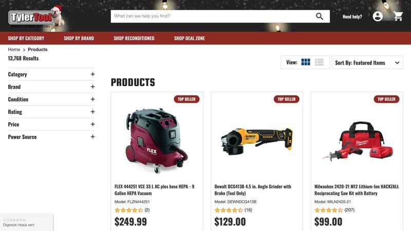 На этом сайте есть следующие основные категории: ручной инструмент, оборудование для обработки дерева и металла, принадлежности для сада и ремонта автомобилей, электроинструменты (дрели, пилы, гвоздезабивные пистолеты, шлифовальные машины и многое другое), спецодежда, боксы для хранения, компрессорное оборудование, энергоблоки. В разделе Deal Zone всегда есть “горячие” предложения на категории товаров. Например, приличная скидка при покупке от определенной суммы (сравнительно небольшой). Или подарок, пилА или другой продукт известной марки. Удобно то, что промоакции можно отфильтровать по бренду или типу инвентаря. Если вы покупаете продукцию из категории «восстановленные», ваша выгода составит 30-50%.