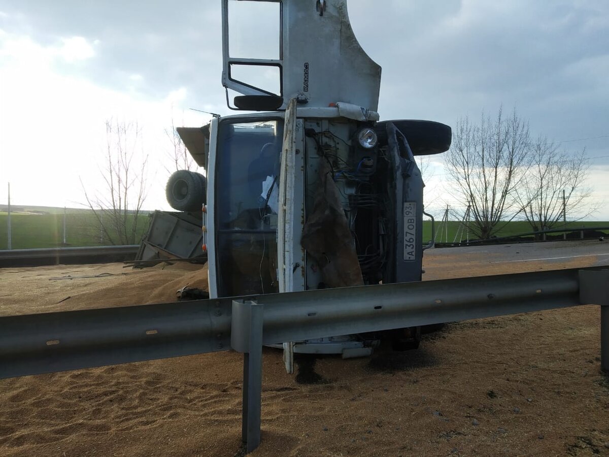 На объездной трассе г. Крымска произошло ДТП. Со стороны мкрн Надежда в сторону газовой заправки двигался легковой автомобиль ВАЗ 2112, который вышел на полосу обгона, но увидев препятствие стал возвращаться в свою полосу, при этом въехав в впереди идущий зерновоз. От удара ВАЗ выбросило на встречную полосу, где он врезался в другой зерновоз, который двигался навстречу. От столкновения зерновоз