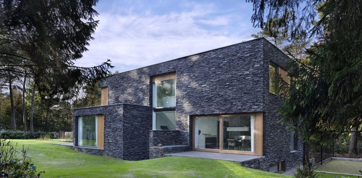 Эта экзотическая вилла расположена в Нидерландах, она спроектирована известной местной архитектурной компанией Zecc Architecten и построена в 2009 году. Брутальный, но притягательный и эффектный вид этого дома создаётся за счет использования дикого облицовочного камня. Его грубая выразительная фактура формирует актуальный экологичный образ, созвучный с окружающей средой. Сам по себе природный камень является очень надежным и долговечным материалом. Он не нуждается в специальной обработке, без проблем переносит высокую влажность, зной. Не деформируется и не изнашивается.