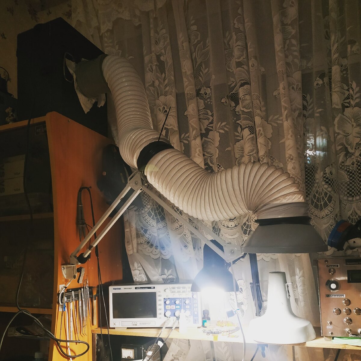 Расход воздуха 480м кубических. Тащит все это через угольный фильтр + фильтр из тонкой ткани, для фильтрации от пыли. Забор воздуха обрезанный плафон от настольной лампы.