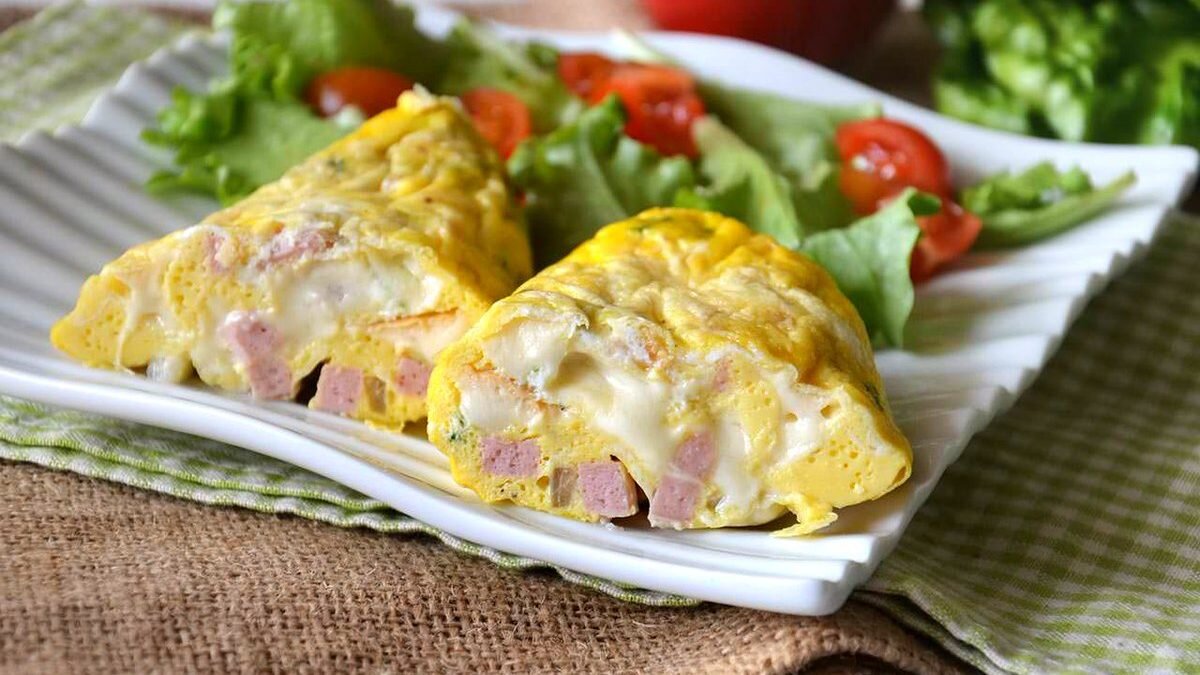 Если наскучил привычный жареный омлет, то вот шикарный вариант! Рецепт не подразумевает масла, так что можно назвать его диетическим - и форму такой омлет держит хорошо, так что нарезав его, можно даже неплохо украсить стол.