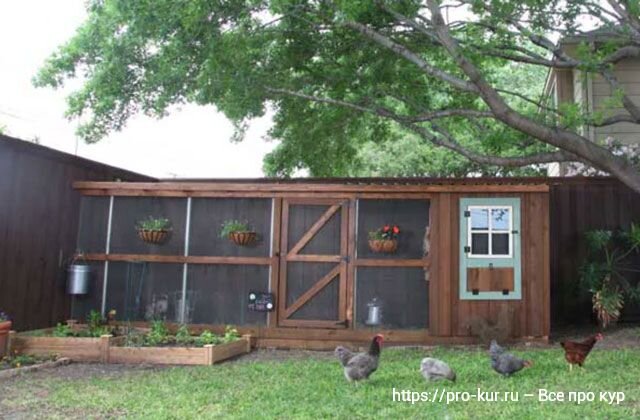 У этого курятника отличное место под старым тенистым деревом. Летом лиственный полог помогает стаду пережить изнуряющий зной, а зимой солнечный свет струится сквозь голые ветви, даря тепло. Выгульный дворик украшен висящими корзинами с зеленью. Под окном есть удобная дверца для сбора яиц из гнезда.