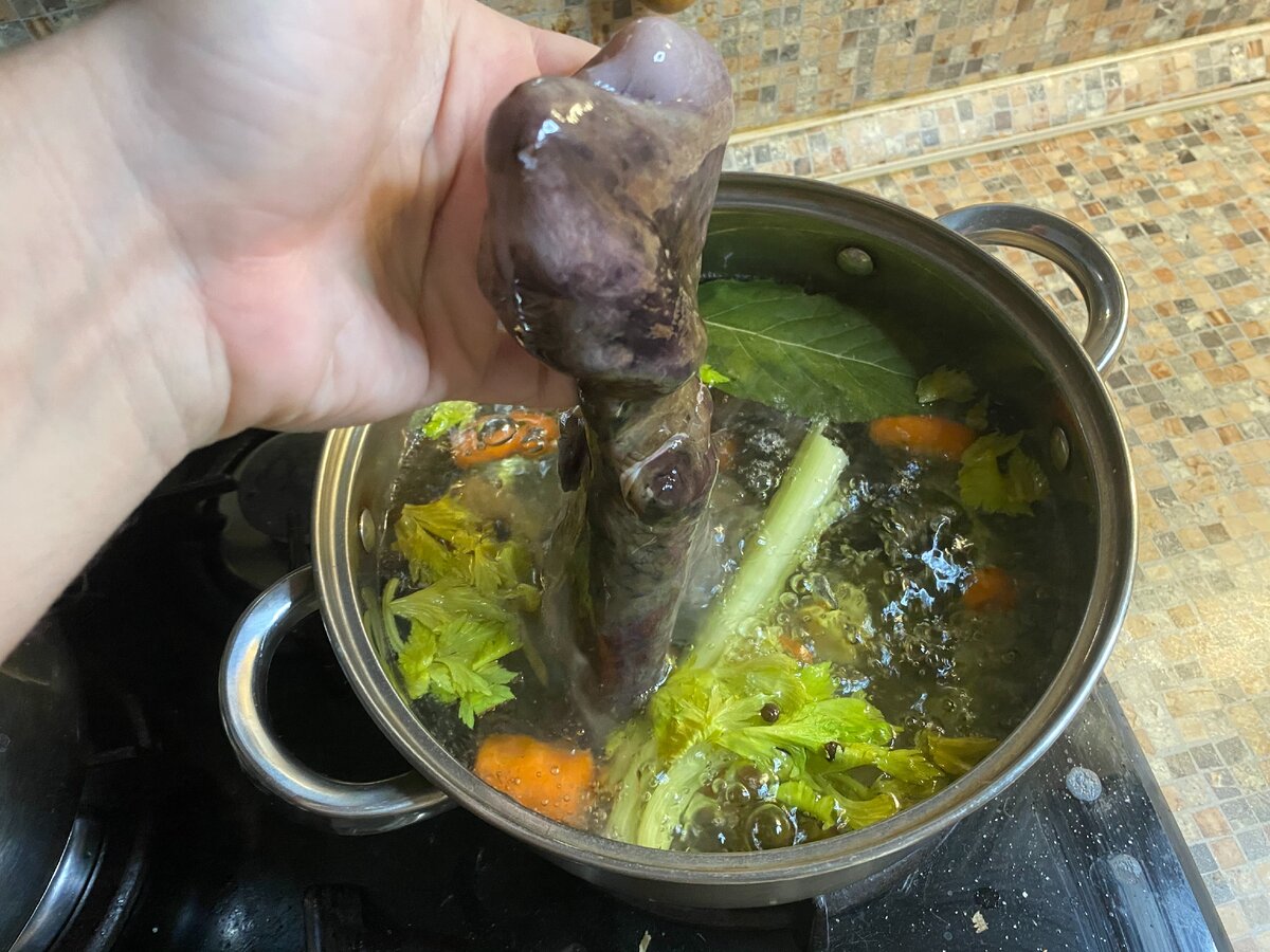 Теперь хватаем кастрюлю и собираем туда все овощные вкусности, которые завалялись в холодильнике. Вот, например, у меня ребенок не стал есть мини морковку, у жены отобрал кусок сельдерея, выбил два зуба зубчика чеснока, ну и так далее... В обязательный список входит лаврушка, перец черный/душистый горошком и, пожалуй, все.