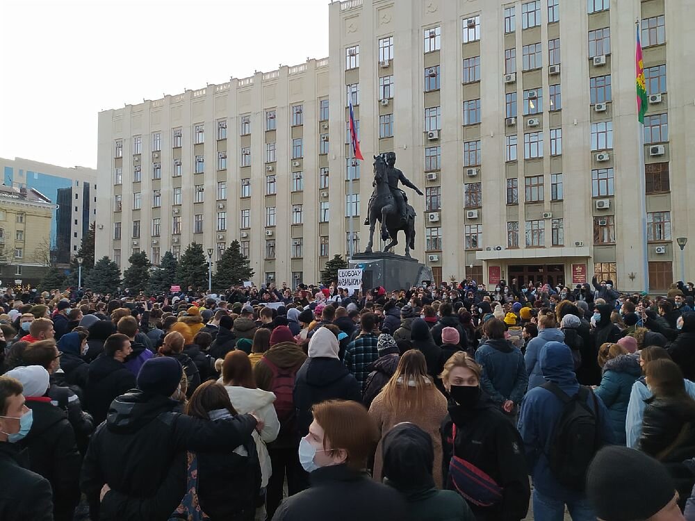 В Краснодаре 23 января началась акция сторонников Алексея Навального. Ранее мероприятие в поддержку оппозиционера власти сочли несанкционированным из-за пандемии коронавируса. Кроме того, организаторы должны были сообщить о его проведении за 10 дней до начала, как того требует закон.