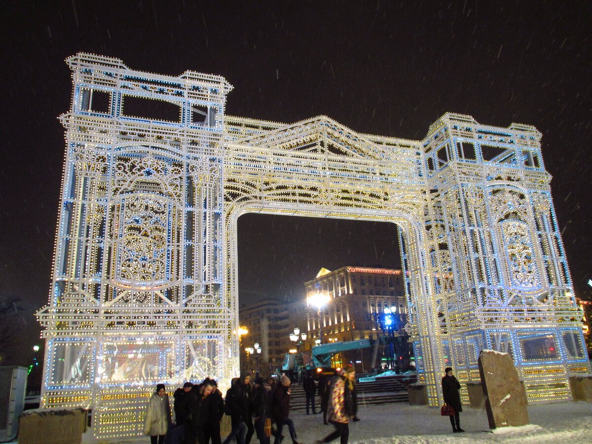 Пушкинская площадь хороша в любое время года, но особенно романтично она выглядит в новогоднем убранстве. Последние несколько лет к новогодним праздникам Пушкинскую площадь украшают светодиодными инсталляциями и огромными светящимися арками. Светодиодные арки устанавливают по обе стороны от Тверской улицы, одну - за памятником Пушкину на Пушкинской площади, вторую - на противоположной стороне улицы - у Новопушкинского сквера.