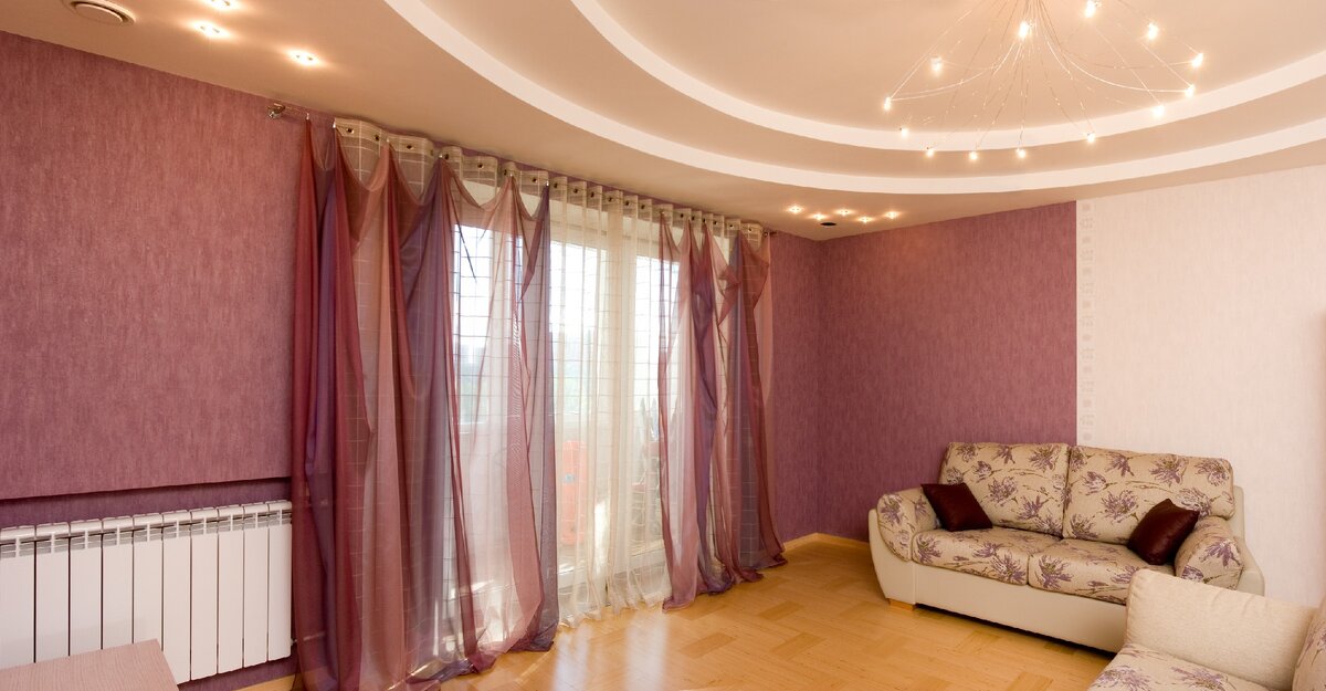 3. Многоуровневые многосложные потолки с использованием цветных натяжных вставок. Прежде всего - это дорого (из гипрока городить несколько уровней, да ещё и волны) и честно говоря, никого уже не впечатлит. Да и не стоит забывать, что в лучшем случае в квартире потолки 2,7 м в высоту (старый фонд не в счёт). А нагромождая уровни, можно получить очень давящий потолок. Да и цветные натяжные потолки скорее подойдут для общественных помещений. В редких случаях цвета можно добавить в санузлах за счет потолка, но главное не переборщить.