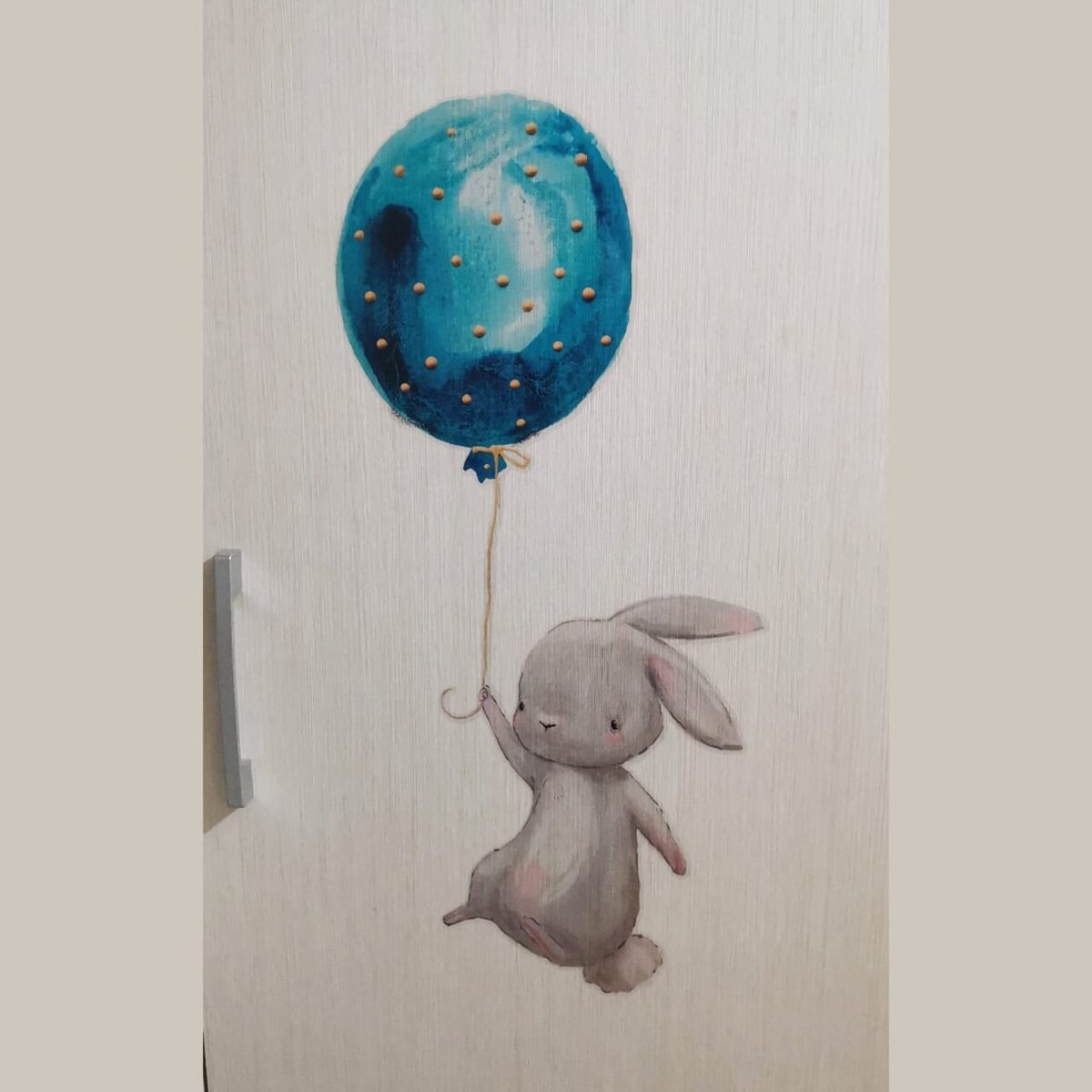 Забыла написать, что продавец в подарок прислал наклейки реснички. Их детки быстренько наклеили на стену))) А вот зайчика мы наклеили на дверцу шкафа - смотрится прикольно.