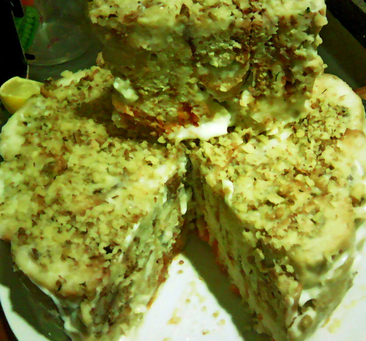 Верхний слой посыпаю орехами и убираю в холодильник на 3 часа, чтобы торт пропитался. Снимаю форму, нарезаю и подаю к столу.