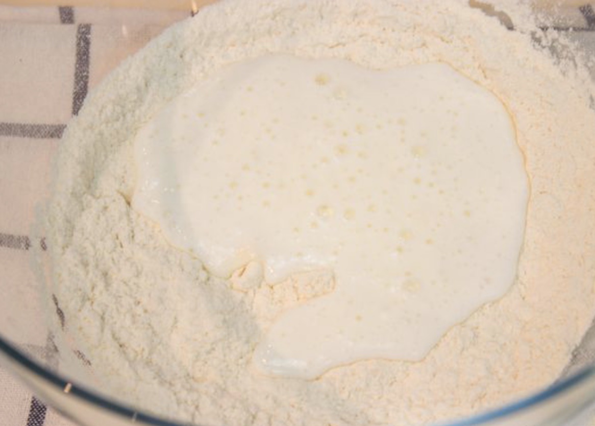 Готовим тесто. В чашку просеваем муку, добавляем соль, сахар, соду, хорошо перемешиваем венчиком и добавляем тёплый кефир. Перемешиваем.