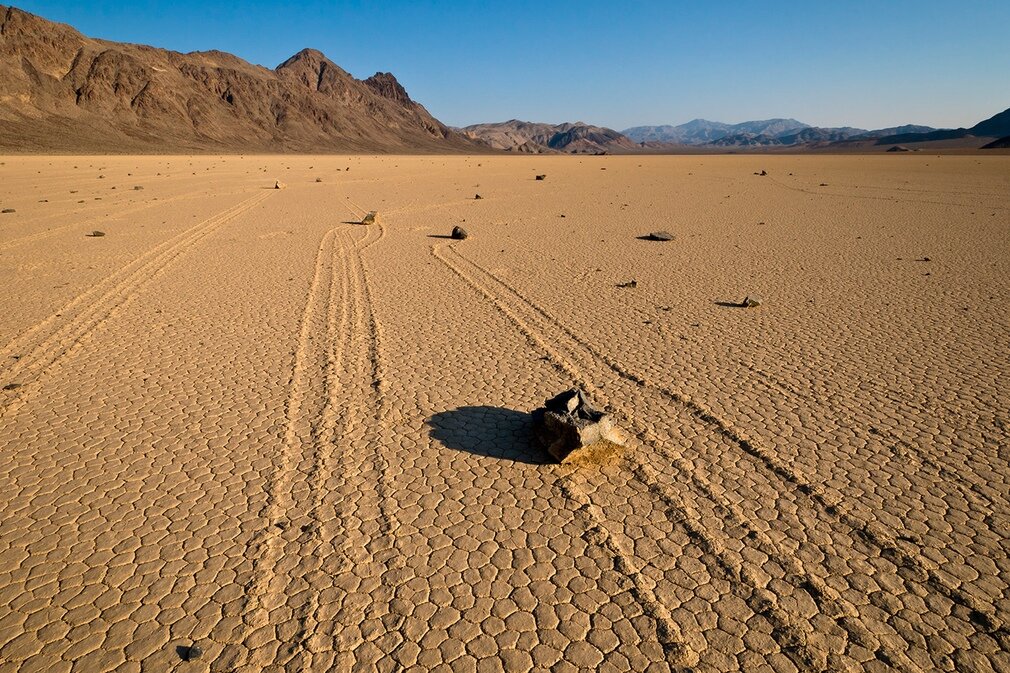 Обнаружив сотни камней, которые словно переместились по дну высохшего озера Рейстрэк-Плайя в калифорнийском национальном парке "Долина смерти", оставив за собой заметный след, ученые оказались в тупике. Как такое количество булыжников - некоторые весом под 300 килограммов - могло переместиться по этой отдаленной части парка на целых 250 метров.