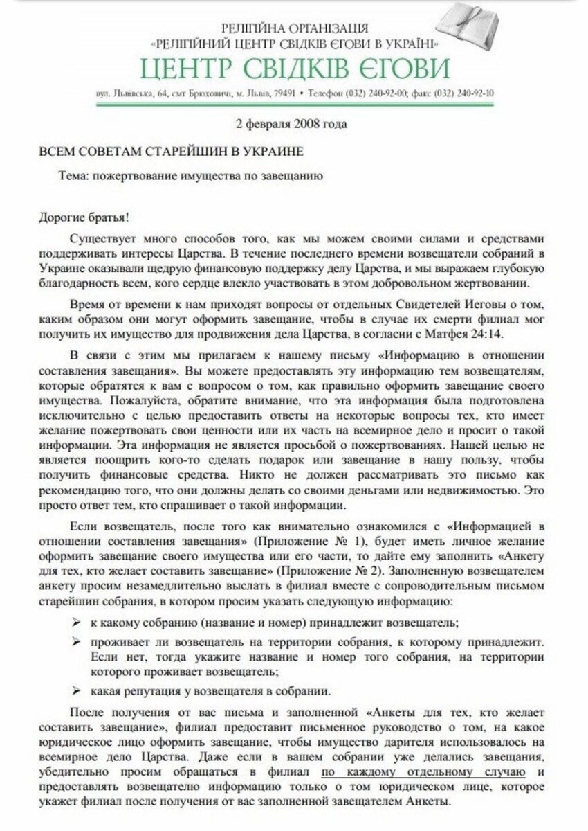 Также можно привести массу сопутствующих документов. Например, в письме старейшинам собраний от 2 февраля 2008 года дается указание о заполнении рядовыми членами бланков для оформления завещаний на недвижимость. При этом особо оговариваются два момента. Во-первых, чтобы «возвещатель» смог подписать такую бумагу, как говорится, без проблем, старейшины имеют право оплатить пошлину за оформление документов из кассы собрания. Во-вторых, после смерти «возвещателя», члены собрания не имеют права «мародерствовать» - выносить из жилища мебель и прочее имущество умершего, чья недвижимость зарегистрирована на ОСБ.