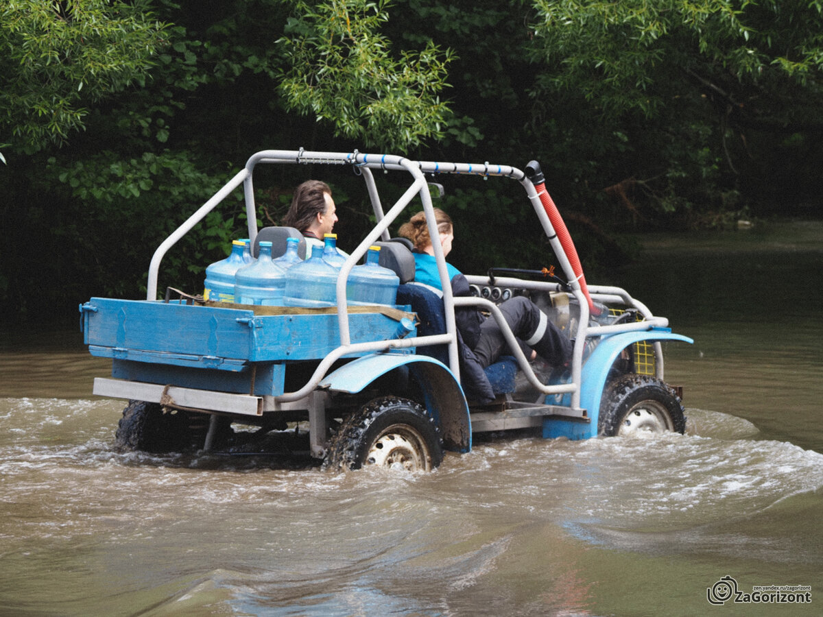Что делает тот человек в реке? Ищет номер! Это же классика джиперов. Среди нас оказался тот, кто еще не терял номер, проходя брод, не закрепил его как надо, и поэтому мы предоставили ему право пройти боевое крещение и потерять номер. Хорошо, что нашли. И хорошо, что искали, потому что увидел прикольную самоделку.