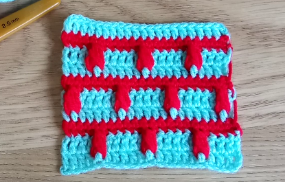 Будем вязать одним цветом два ряда Столбики с накидом и два ряда другим цветом Столбики без накида.