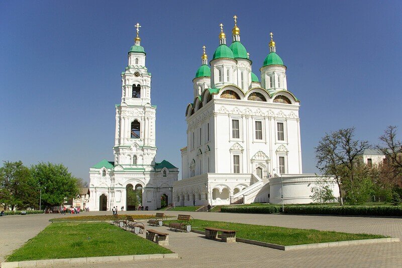 Успенский собор на территории Астраханского кремля, возведение которого датируют 1710 годом, считается одним из лучших примеров культового зодчества XVIII столетия. Уникальность храма заключается в том, что он единственный в России объединен с лобным местом — каменным помостом, который использовался во время крестного хода и для оглашения царских указов народу. По большей части строительство Успенского кафедрального собора велось на средства местных купцов, так как государство отказало духовенству в поддержке. Впрочем, как вы сможете заметить, храм получился величественным и очень красивым, что свидетельствует о щедрых пожертвованиях от купечества. Увы, но большая часть внутреннего убранства и реликвий Успенского собора оказались утрачены в ходе реквизиции большевиками. Стены с росписями закрасили, уникальный восьмиярусный иконостас сожгли, а сам облик храма оказался изуродован. И всё же, по большей части, сегодня собору возвращен дореволюционный вид, поражающий масштабами и изяществом форм.