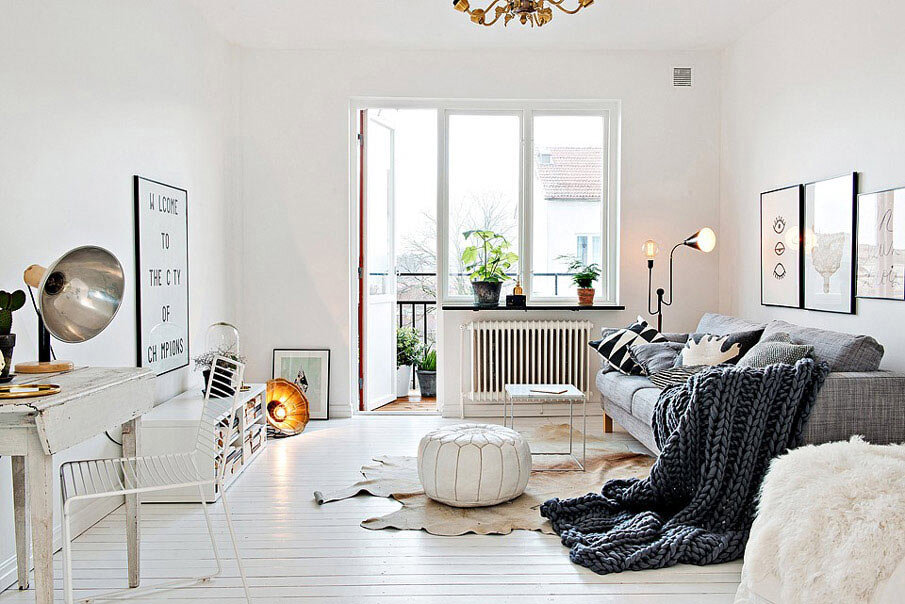 Сканди (сокращённый вариант названия) – это светлые (преимущественно белые или серые) стены, много дерева (вообще натуральных, минимально обработанных элементов), яркие акцентные детали (диванные подушки, пледы и т.д.) и много света. Такой интерьер очень хорошо впишется, как и в большую современную квартиру, так и в маленькую хрущёвку, в которой он будет смотреться особенно актуально, расширяя пространство и наполняя помещение столь необходимой лёгкостью. Учитывая, что дома старого фонда предполагают узкие коридоры и маленькие кухни, света в них, зачастую, не хватает. Скандинавский стиль поможет это исправить – он предполагает большое количество светильников, включая всевозможную подсветку, бра, торшеры.