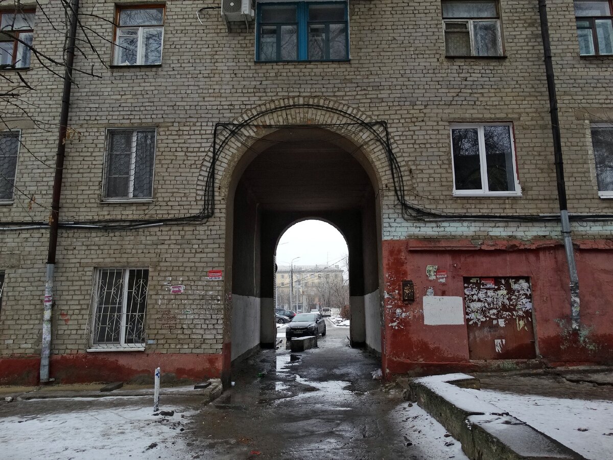 Подворотня как портал в иную реальность. С той стороны совсем недавно закончили реконструкцию территории у ДК. Сейчас там новый тротуар, всё выглядит аккуратно и современно. А во дворе по соседству о ремонте только мечтают. Да что о ремонте, там снег и лёд с дорог не убирают. В итоге, во дворах скользко, грязно, под ногами смесь воды, льда и песка с солью. Типичная картина для большинства дворов города картина, но почему-то здесь она выглядит особенно удручающе. Может дело в обшарпанных стенах домов?