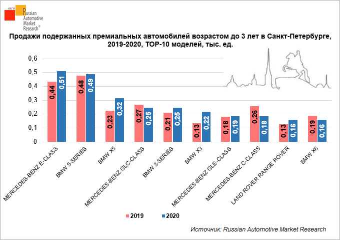 По данным Russian Automotive Market Research, в 2020 г. продажи подержанных премиальных легковых автомобилей возрастом до 3 лет в Санкт- Петербурге выросли на 9,0% по сравнению с 2019 г. и составили 6,33 тыс. ед. При этом доля премиального сегмента на рынке «свежей» подержанной техники увеличилась с 29,2% до 31,1%.