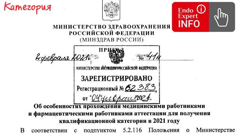 - Приказ Министерства здравоохранения Российской Федерации от 02.02.2021 № 41н "Об особенностях прохождения медицинскими работниками и фармацевтическими работниками аттестации для получения квалификационной категории в 2021 году"
