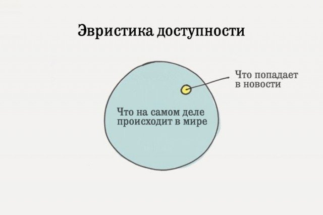 Каких слов больше - те, что начинаются на букву 'к' или тех, где "к" стоит третьей по счету? Вероятнее всего те слова, что быстрее придут к вам в голову и будут определять ваш ответ. Если вам в голову пришли слова карман, картошка, календарь, то слов, на букву 'к' больше - также и наоборот. Однако так или иначе ваш вывод будет основан не на фактах, а на предположении, иллюзии. Теперь приведем более практичный пример - если все вокруг, во всех новостях, из каждого угла будут говорить о чем-то, с чем вы могли даже не сталкиваться - вы рано или поздно в это поверите. Но поверите не потому что сами убедились, что это так, а потому что информация, как сарафанное радио, разносится ото всюду.